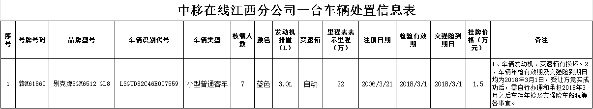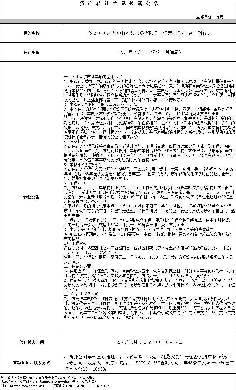 (2020)0157號(hào)中移在線服務(wù)有限公司江西分公司1臺(tái)車輛轉(zhuǎn)讓