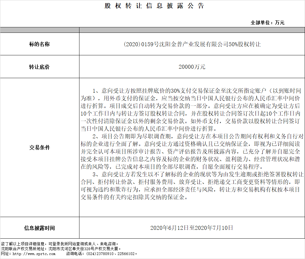 沈陽金普產(chǎn)業(yè)發(fā)展有限公司50%股權(quán)轉(zhuǎn)讓