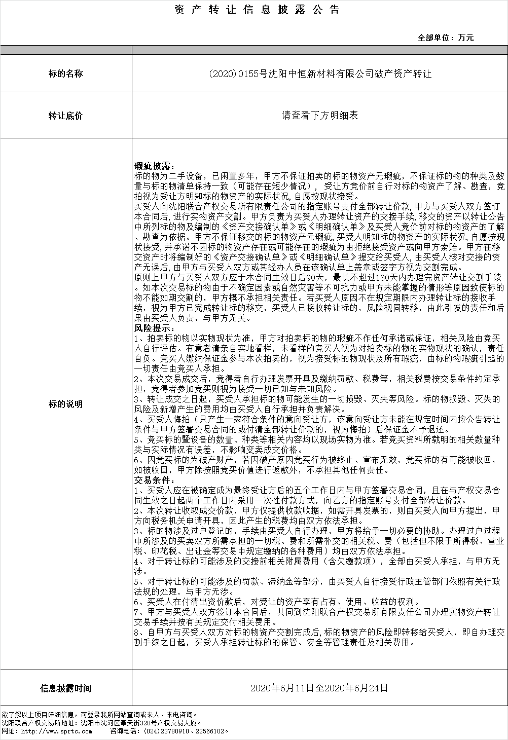 (2020)0155號(hào)沈陽(yáng)中恒新材料有限公司破產(chǎn)資產(chǎn)轉(zhuǎn)讓