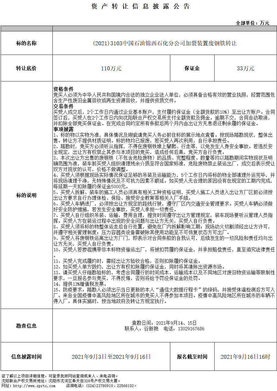 中國石油錦西石化分公司加裂裝置廢鋼鐵轉(zhuǎn)讓項(xiàng)目