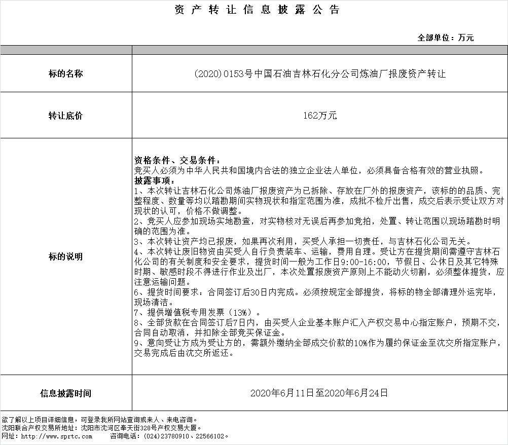 (2020)0153號中國石油吉林石化分公司煉油廠報廢資產轉讓