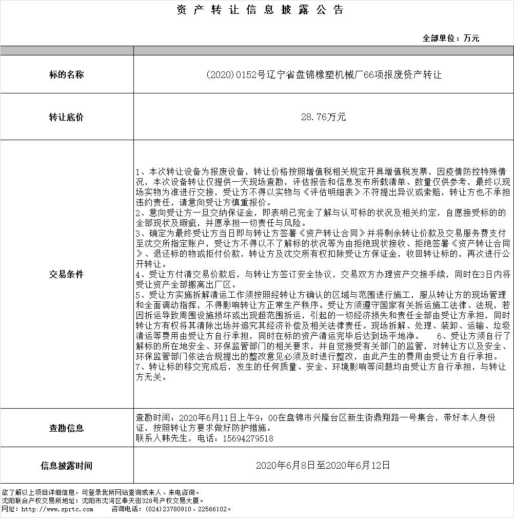 (2020)0152號(hào)遼寧省盤(pán)錦橡塑機(jī)械廠66項(xiàng)報(bào)廢資產(chǎn)轉(zhuǎn)讓