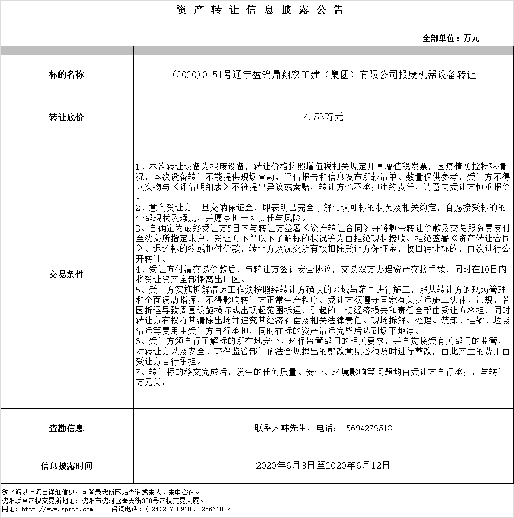 遼寧盤錦鼎翔農(nóng)工建集團(tuán)有限公司報廢機(jī)器設(shè)備轉(zhuǎn)讓。