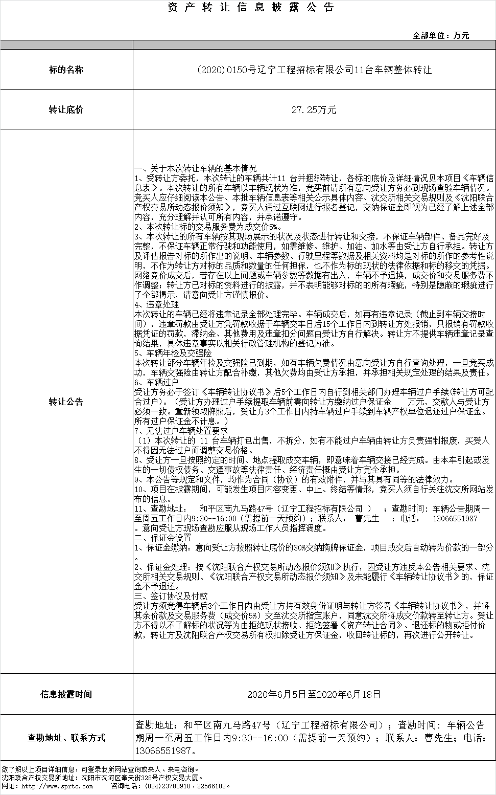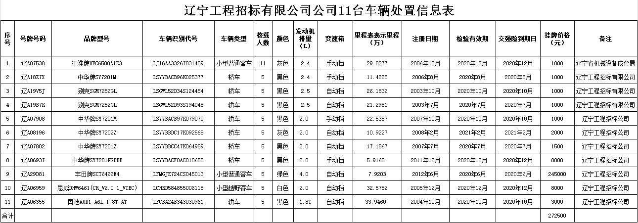 (2020)0150號(hào)遼寧工程招標(biāo)有限公司11臺(tái)車輛整體轉(zhuǎn)讓