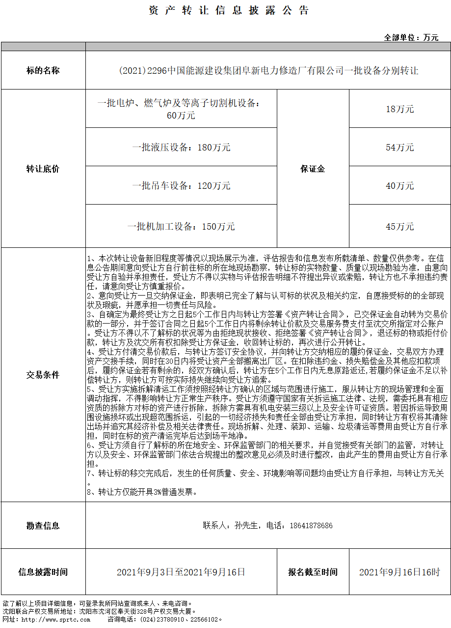 中國(guó)能源建設(shè)集團(tuán)阜新電力修造廠有限公司一批電爐、燃?xì)鉅t及等離子切割機(jī)設(shè)備轉(zhuǎn)讓