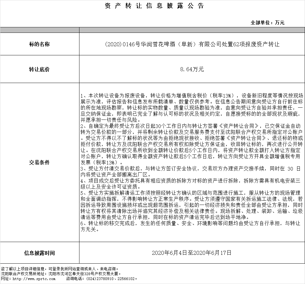 華潤雪花啤酒(阜新)有限公司62項報廢資產(chǎn)轉(zhuǎn)讓。