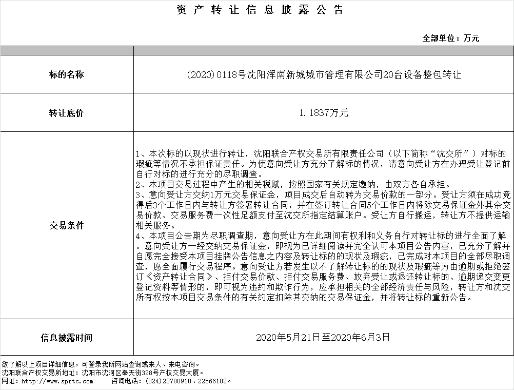 (2020)0118號沈陽渾南新城城市管理有限公司20臺設(shè)備整包轉(zhuǎn)讓