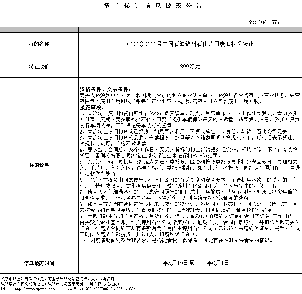 (2020)0116號中國石油錦州石化公司廢舊物資轉(zhuǎn)讓