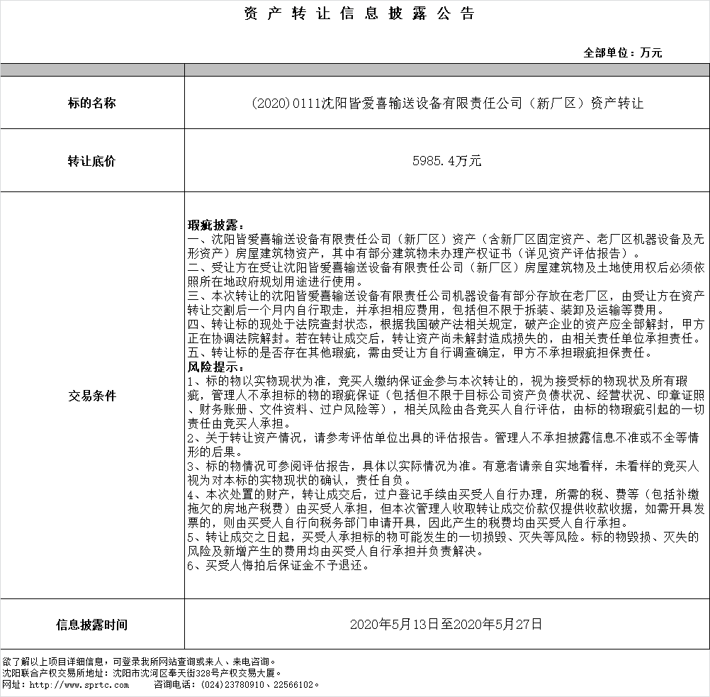 沈陽皆愛喜輸送設備有限責任公司(新廠區(qū))資產(chǎn)( 含新廠區(qū)固定資產(chǎn)、老廠區(qū)機器設備及無形資產(chǎn))。
