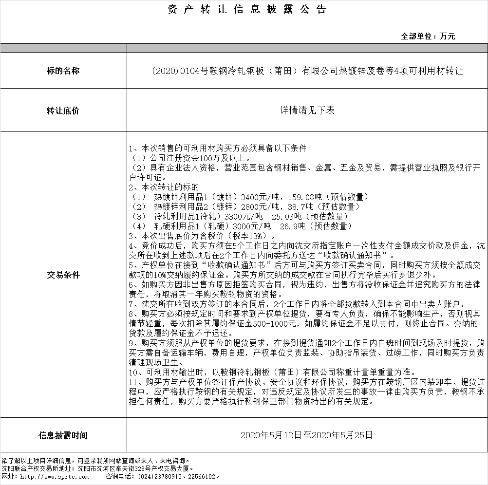 (2020)0104號鞍鋼冷軋鋼板(莆田)有限公司熱鍍鋅廢卷等4項可利用材轉(zhuǎn)讓