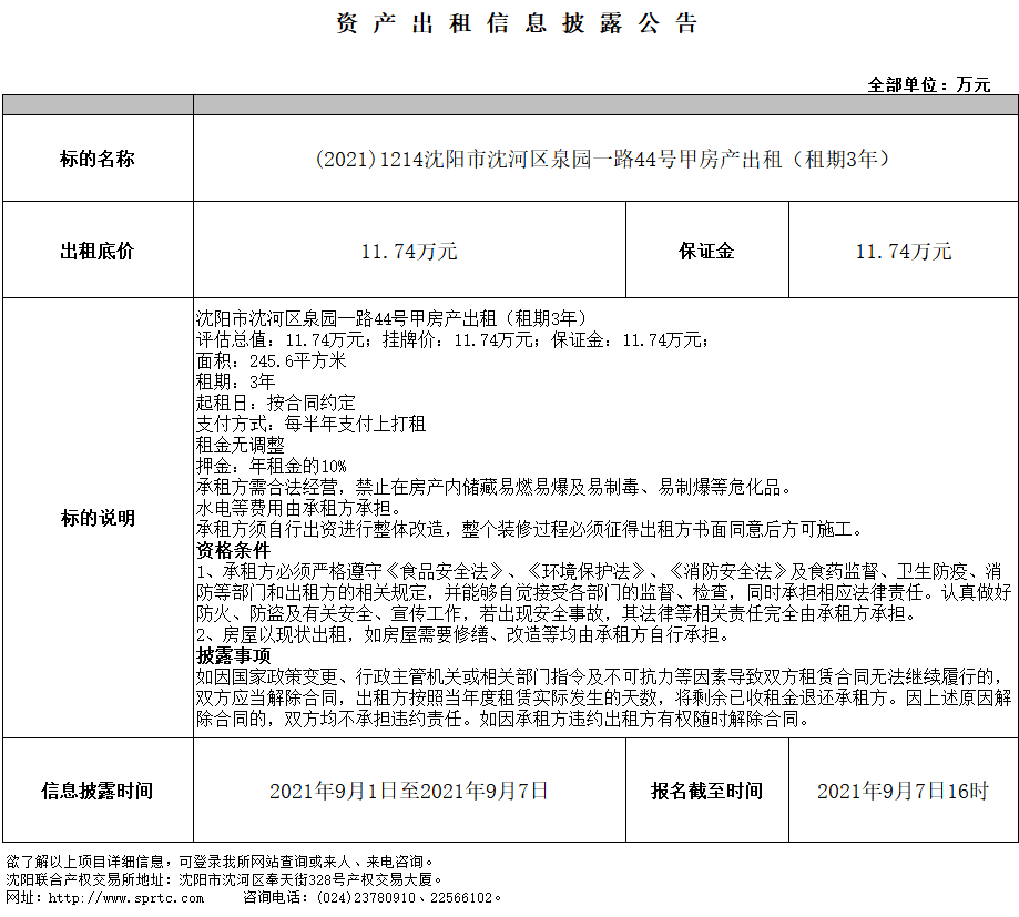 沈陽市沈河區(qū)泉園一路44號(hào)房產(chǎn)出租(租期3年)