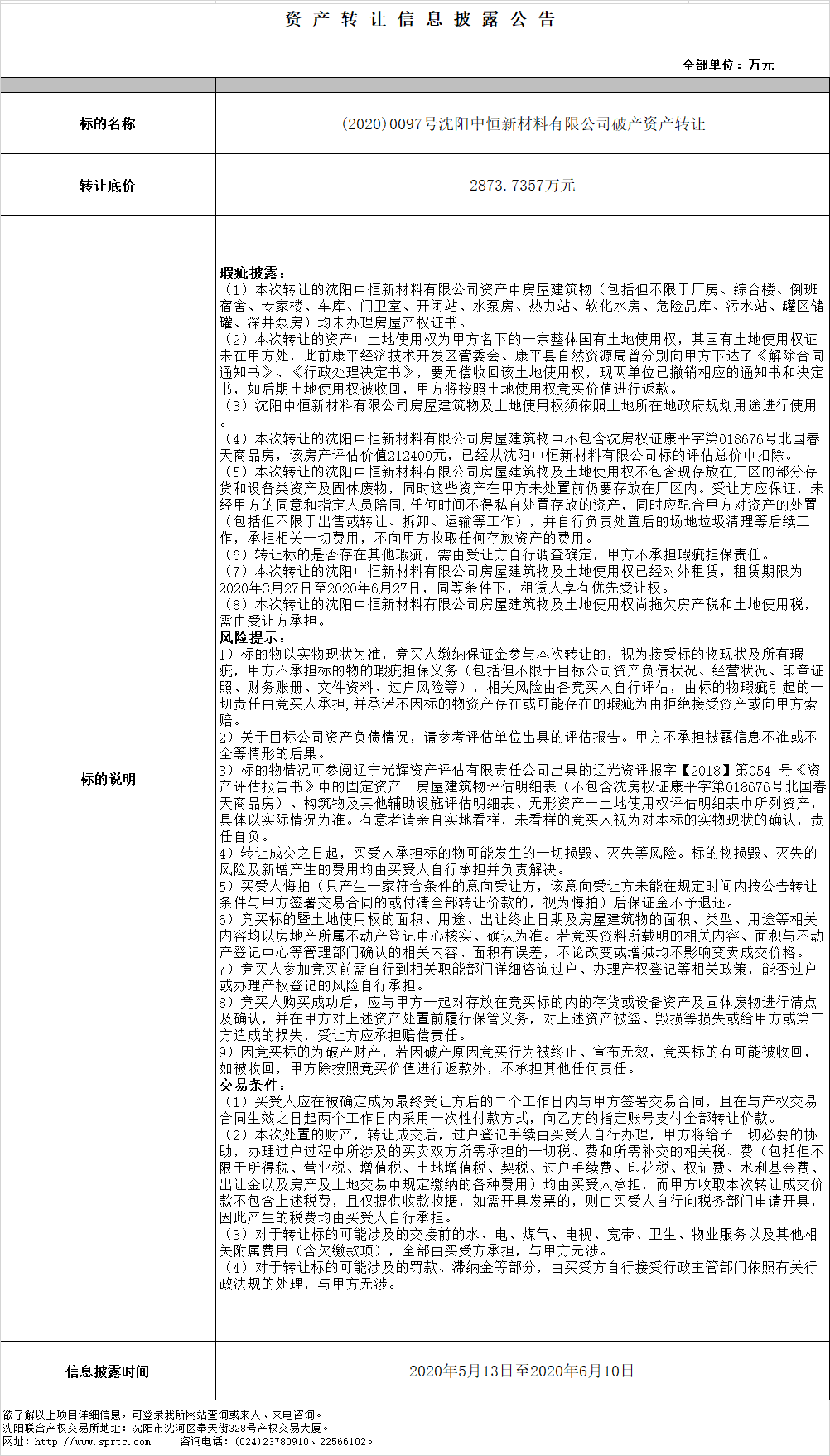 沈陽(yáng)中恒新材料有限公司房屋建筑物、土地使用權(quán)轉(zhuǎn)讓。
