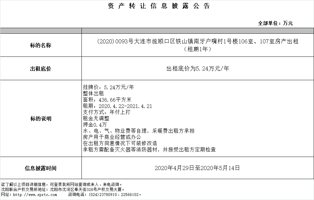大連市旅順口區(qū)鐵山鎮(zhèn)南牙戶嘴村1號樓106室、107室房產(chǎn)出租(租期1年)。
