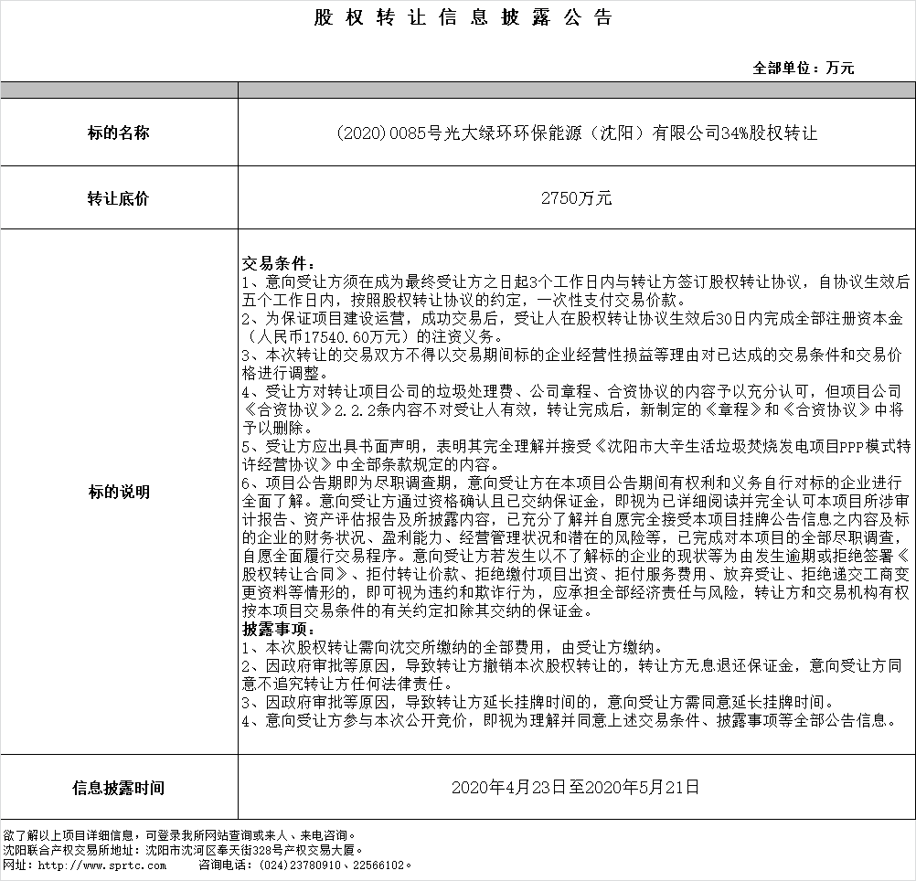 光大綠環(huán)環(huán)保能源(沈陽)有限公司34%股權(quán)轉(zhuǎn)讓。