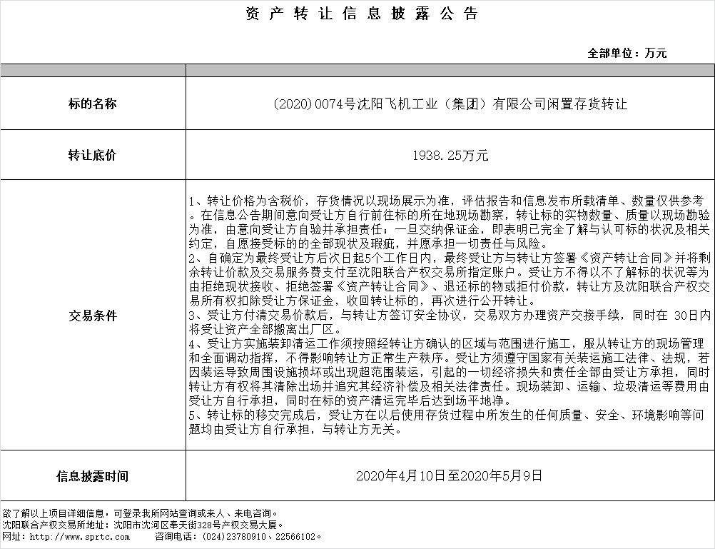 沈陽(yáng)飛機(jī)工業(yè)(集團(tuán))有限公司閑置存貨轉(zhuǎn)讓。