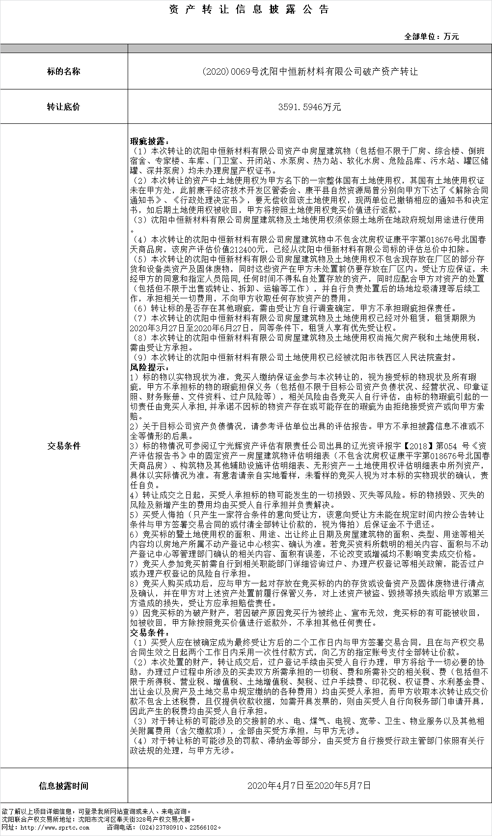 (2020)0069號沈陽中恒新材料有限公司破產資產轉讓