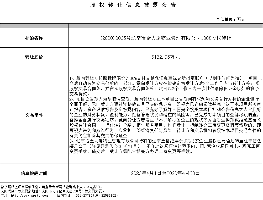 (2020)0065號遼寧冶金大廈物業(yè)管理有限公司100%股權(quán)轉(zhuǎn)讓