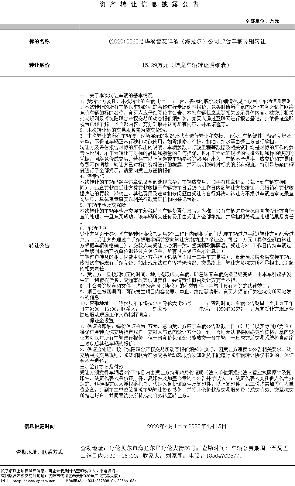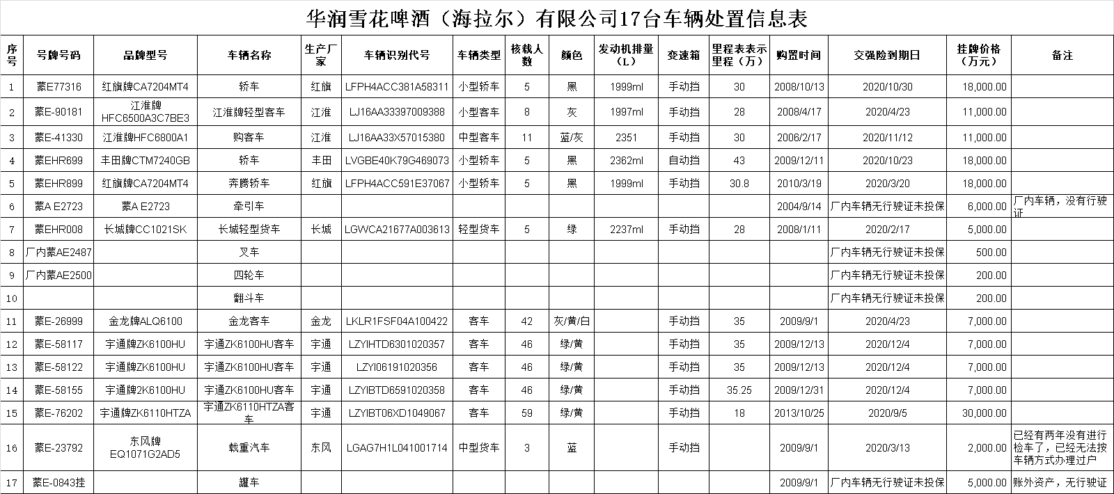 (2020)0060號華潤雪花啤酒(海拉爾)公司17臺車輛分別轉(zhuǎn)讓