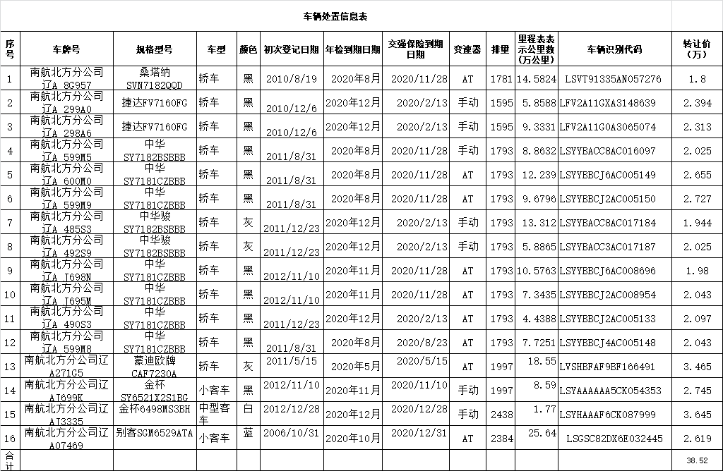 (2020)0023號中國南方航空股份有限公司北方分公司16臺車輛分別轉(zhuǎn)讓