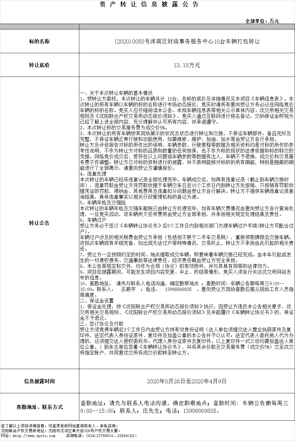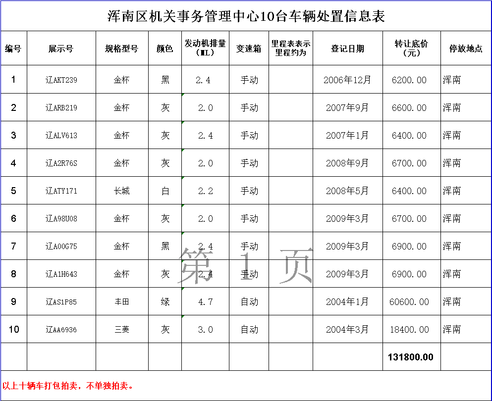 渾南區(qū)財(cái)政事務(wù)服務(wù)中心10臺(tái)車輛打包轉(zhuǎn)讓。