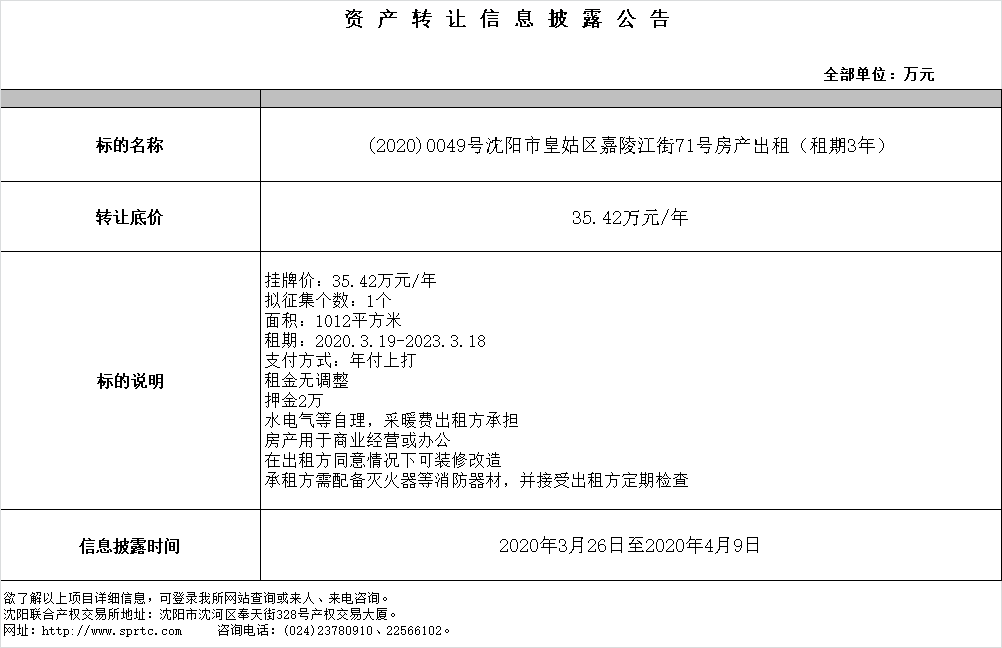 沈陽(yáng)市皇姑區(qū)嘉陵江街71號(hào)房產(chǎn)出租(租期3年)。