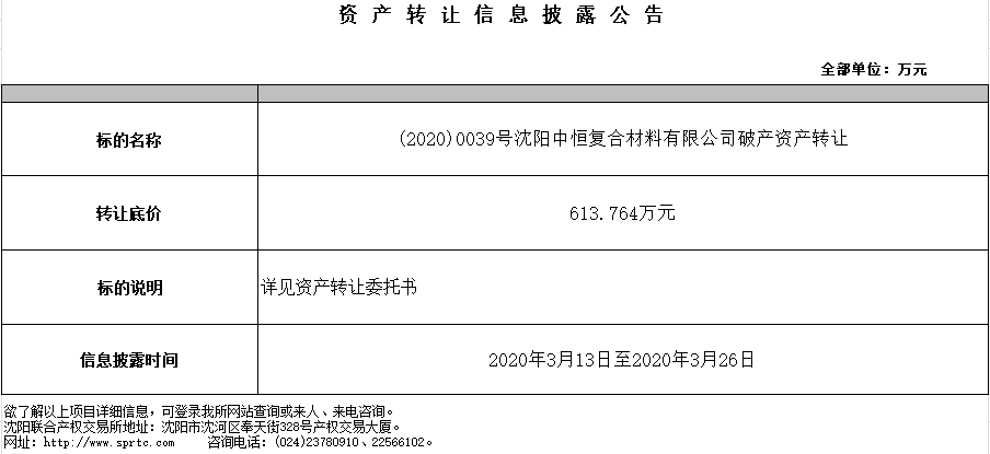 沈陽(yáng)中恒復(fù)合材料有限公司機(jī)器設(shè)備第二次掛牌轉(zhuǎn)讓。