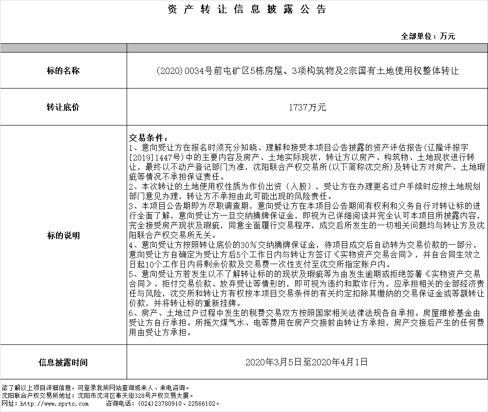 前屯礦區(qū)5棟房屋、3項(xiàng)構(gòu)筑物及2宗國(guó)有土地使用權(quán)整體轉(zhuǎn)讓。