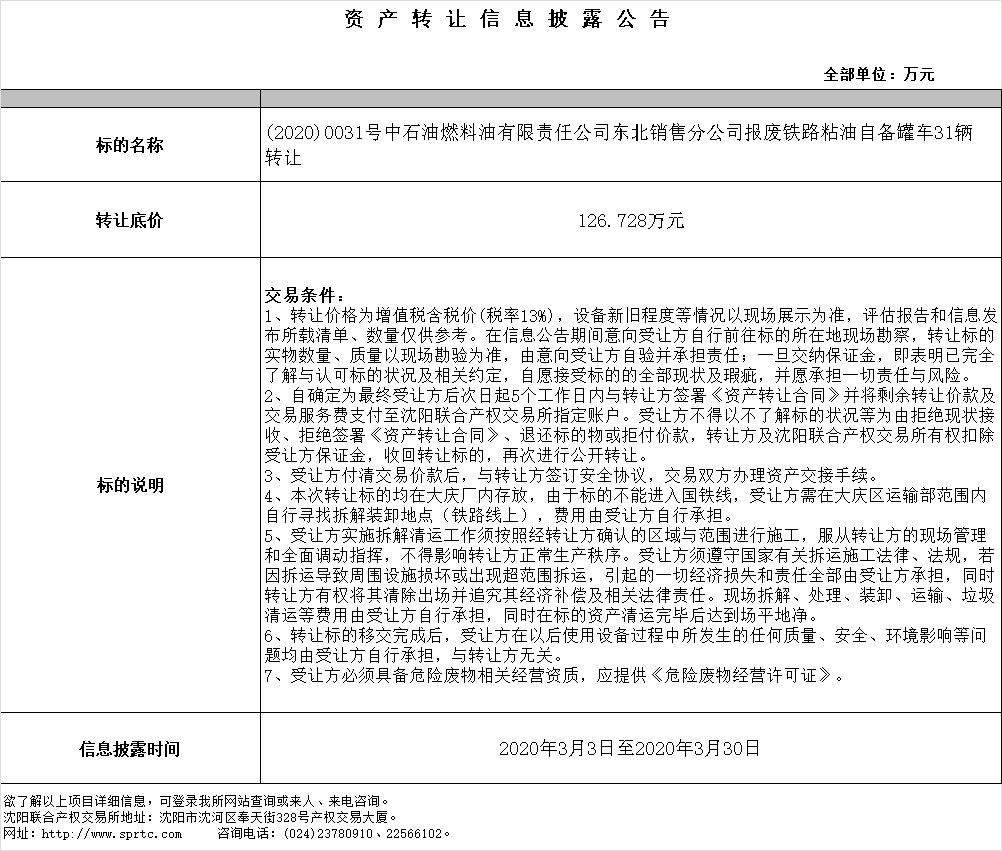 (2020)0031號(hào)中石油燃料油有限責(zé)任公司東北銷售分公司報(bào)廢鐵路粘油自備罐車31輛轉(zhuǎn)讓