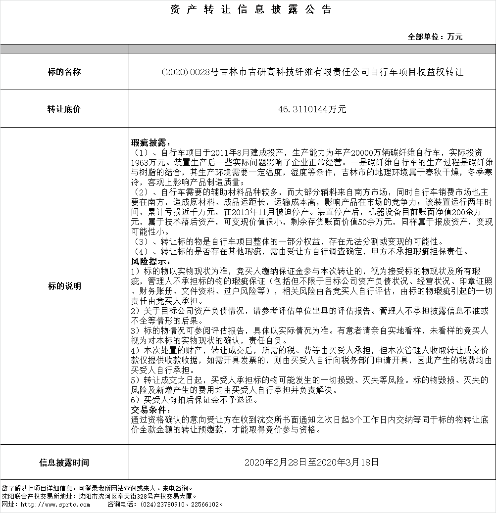 吉林市吉研高科技纖維有限責(zé)任公司自行車項(xiàng)目收益權(quán)轉(zhuǎn)讓。