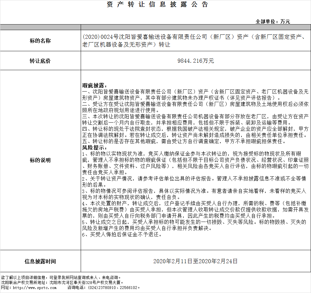 沈陽皆愛喜輸送設(shè)備有限責(zé)任公司(新廠區(qū))資產(chǎn)(含新廠區(qū)固定資產(chǎn)、老廠區(qū)機(jī)器設(shè)備及無形資產(chǎn))。