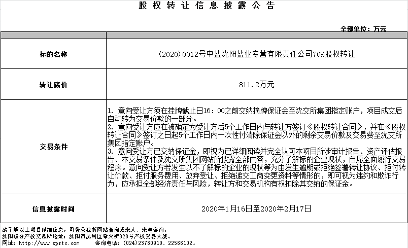 (2020)0012號中鹽沈陽鹽業(yè)專營有限責任公司70%股權轉讓