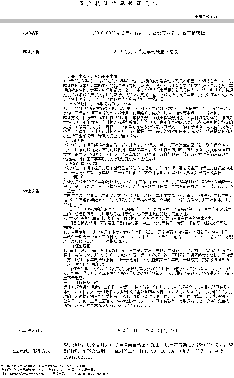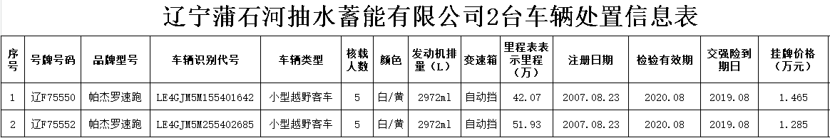 (2020)0007號遼寧蒲石河抽水蓄能有限公司2臺車輛轉(zhuǎn)讓