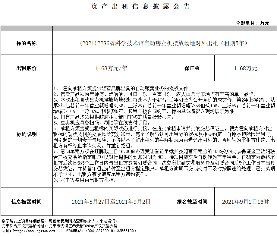 遼寧省科學(xué)技術(shù)館 自動售賣機(jī)擺放場地對外出租(租期5年)