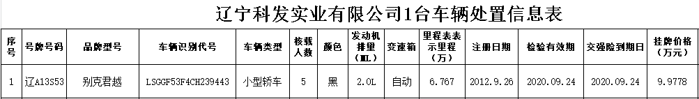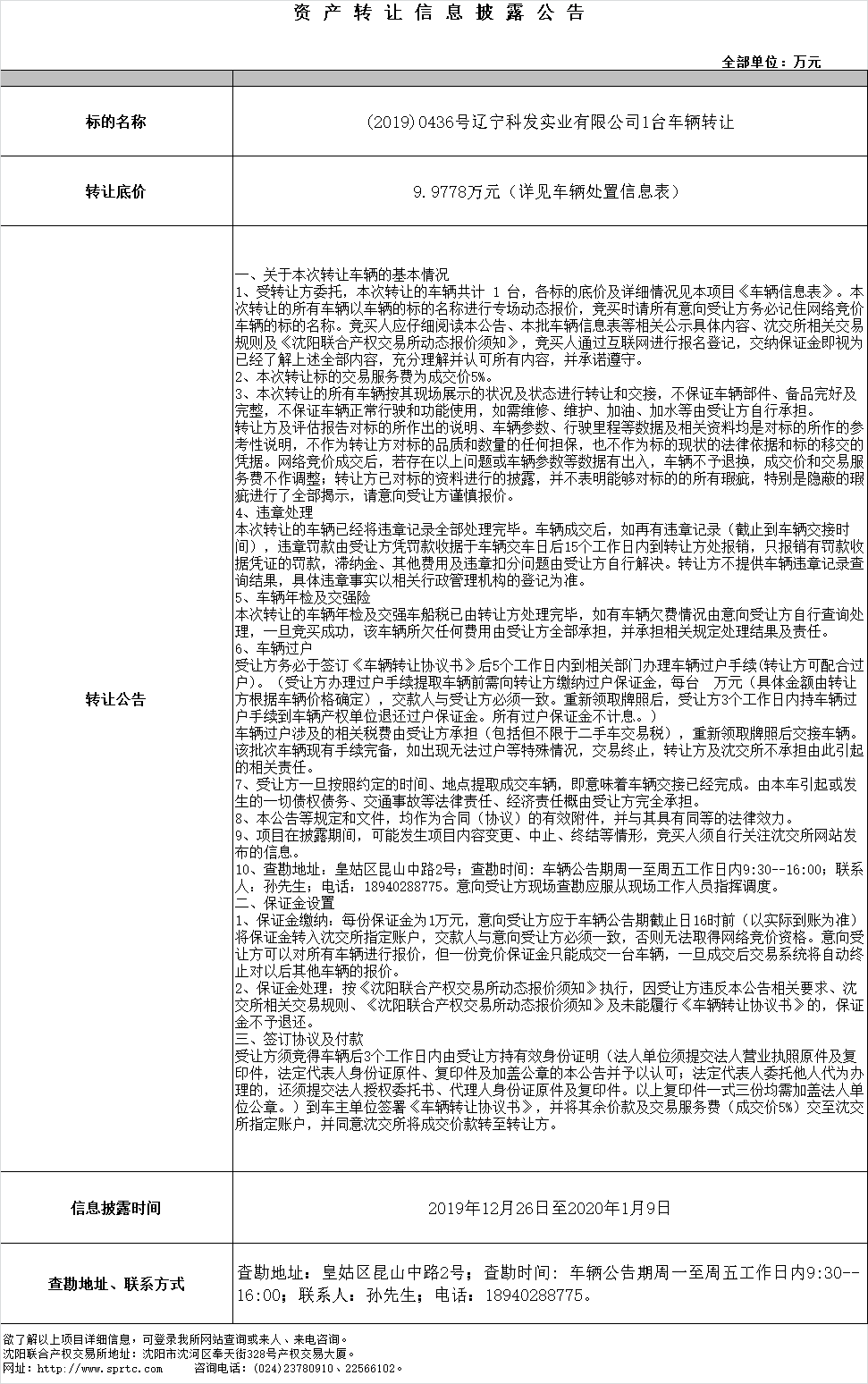 (2019)0436號遼寧科發(fā)實業(yè)有限公司1臺車輛轉(zhuǎn)讓
