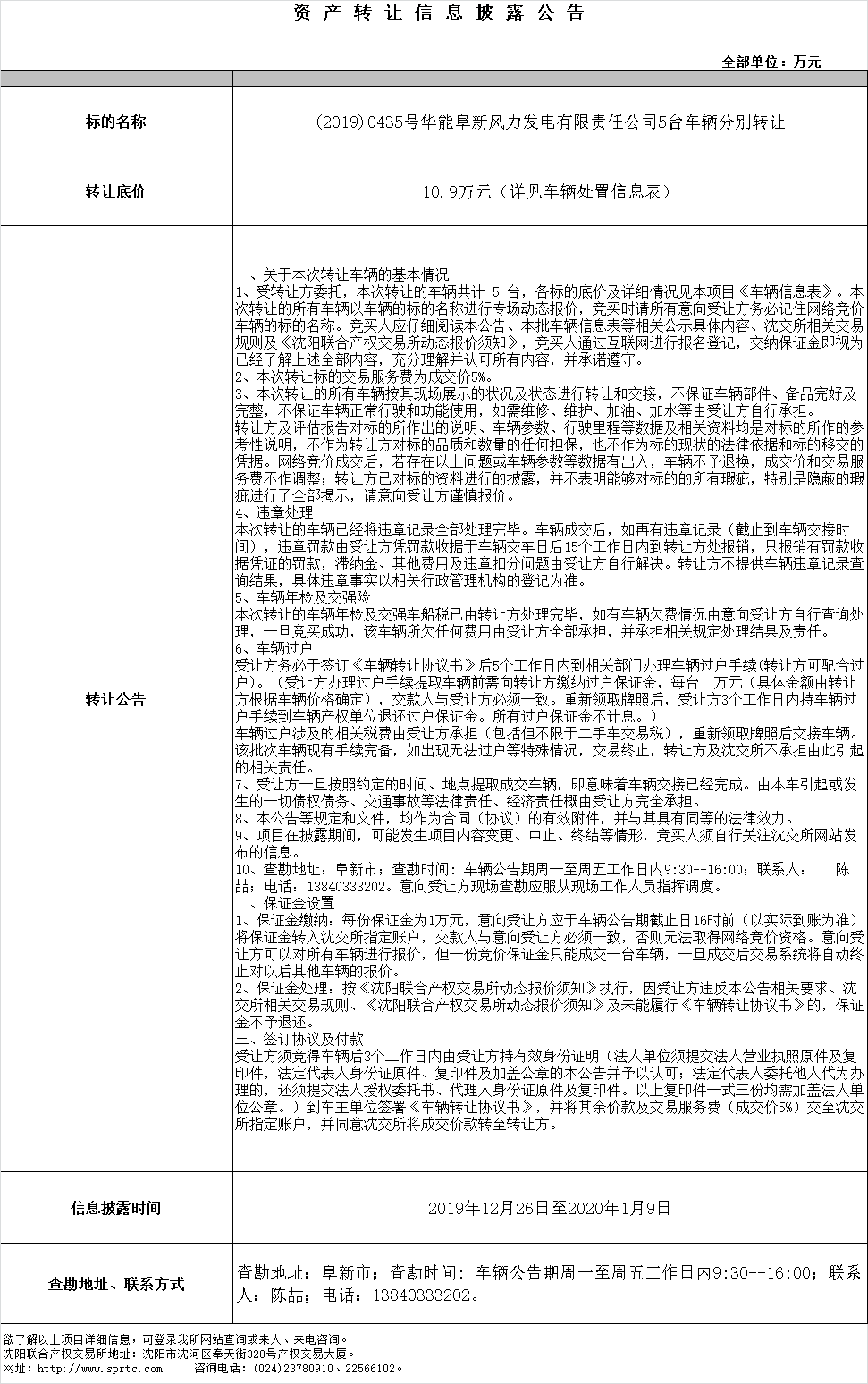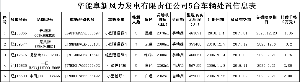 (2019)0435號華能阜新風力發(fā)電有限責任公司5臺車輛分別轉(zhuǎn)讓