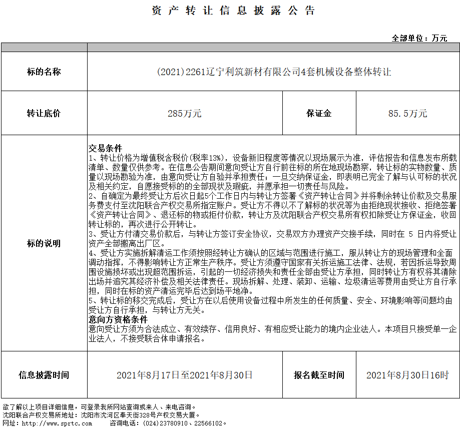 遼寧利筑新材有限公司4套機械設(shè)備整體轉(zhuǎn)讓