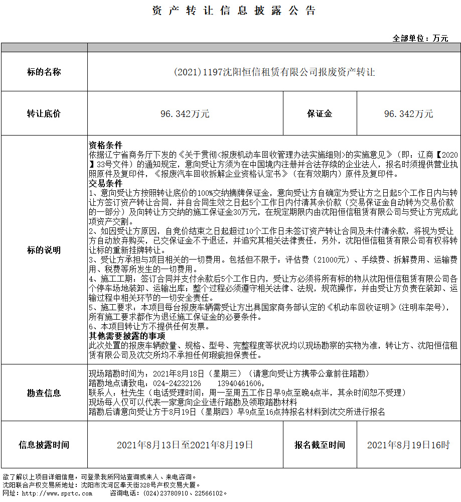 沈陽恒信租賃有限公司報(bào)廢資產(chǎn)轉(zhuǎn)讓