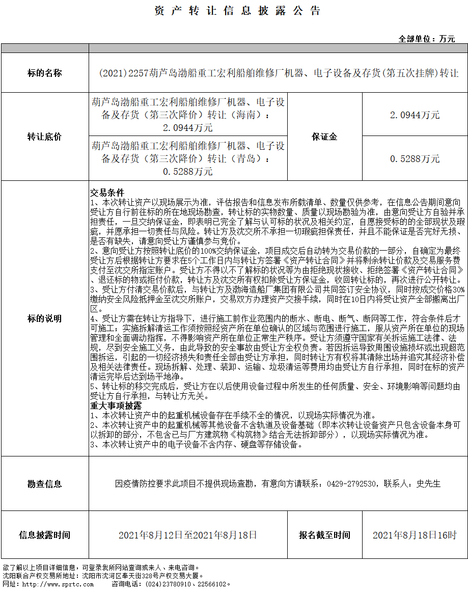 葫蘆島渤船重工宏利船舶維修廠機器、電子設(shè)備及存貨(第三次降價)轉(zhuǎn)讓(海南)