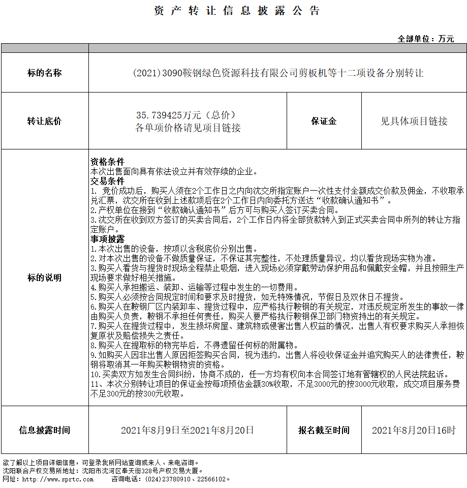 (2021)3090鞍鋼綠色資源科技有限公司剪板機(jī)等十二項設(shè)備分別轉(zhuǎn)讓