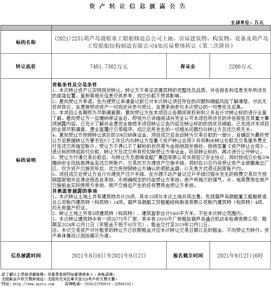 葫蘆島渤船重工船舶修造總公司土地、房屋建筑物、構(gòu)筑物、設(shè)備及葫蘆島工貿(mào)船舶結(jié)構(gòu)制造有限公司4處房屋整體轉(zhuǎn)讓(第二次降價)