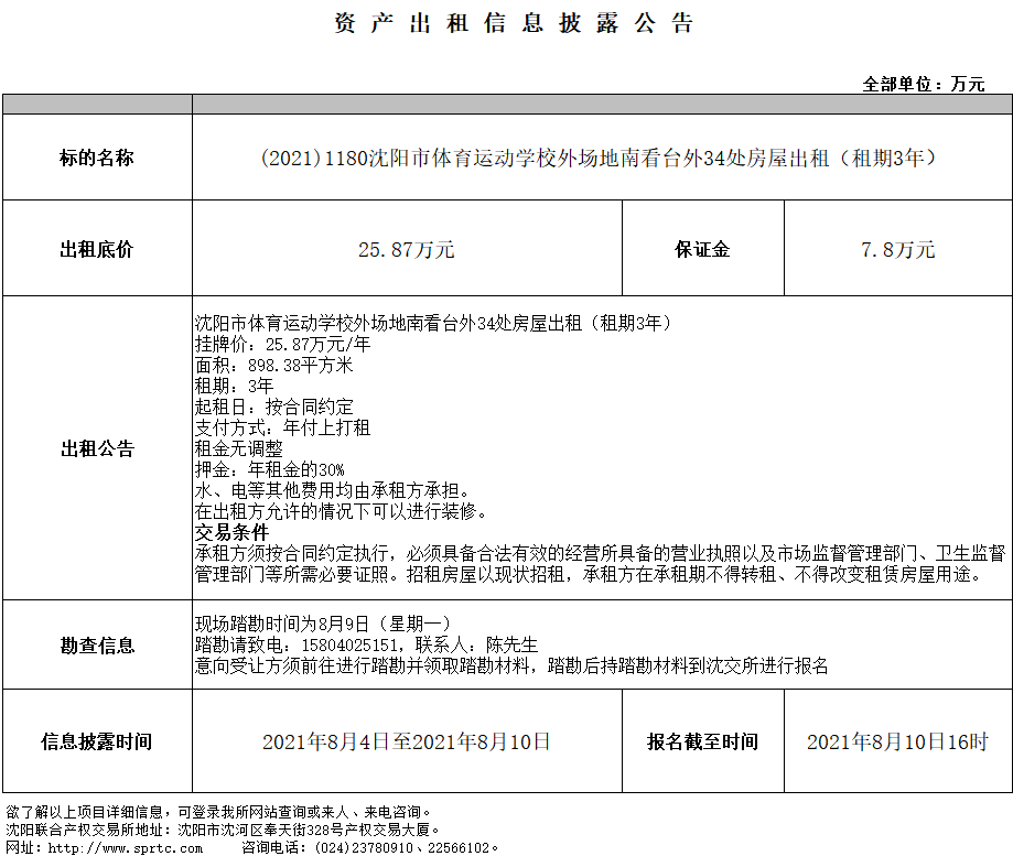 沈陽市體育運動學校外場地南看臺外34處房屋出租(租期3年)