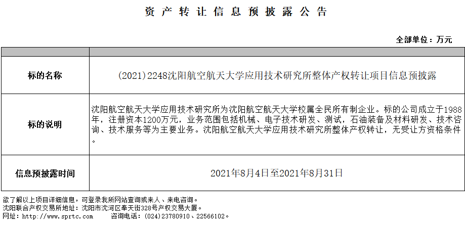 沈陽航空航天大學(xué)應(yīng)用技術(shù)研究所整體產(chǎn)權(quán)轉(zhuǎn)讓信息預(yù)披露