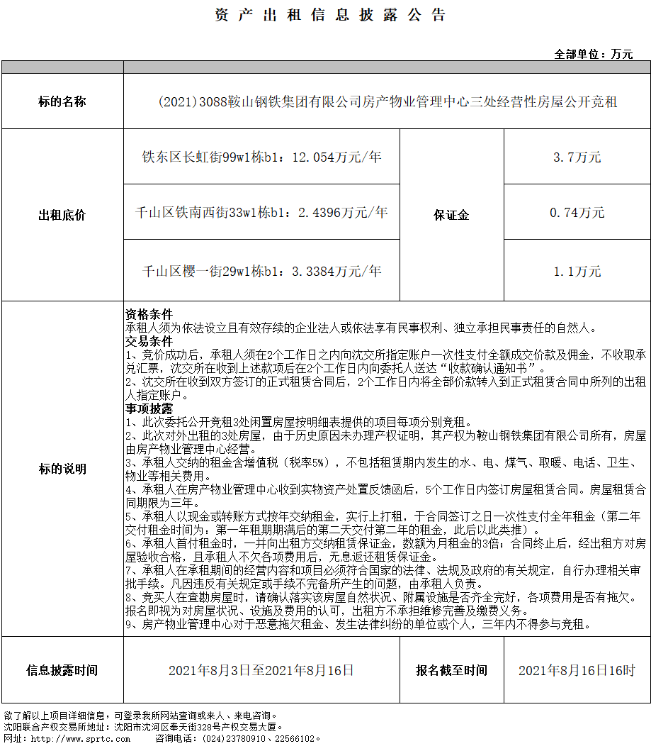 (2021)3088鞍山鋼鐵集團(tuán)有限公司房產(chǎn)物業(yè)管理中心三處經(jīng)營(yíng)性房屋公開(kāi)競(jìng)租