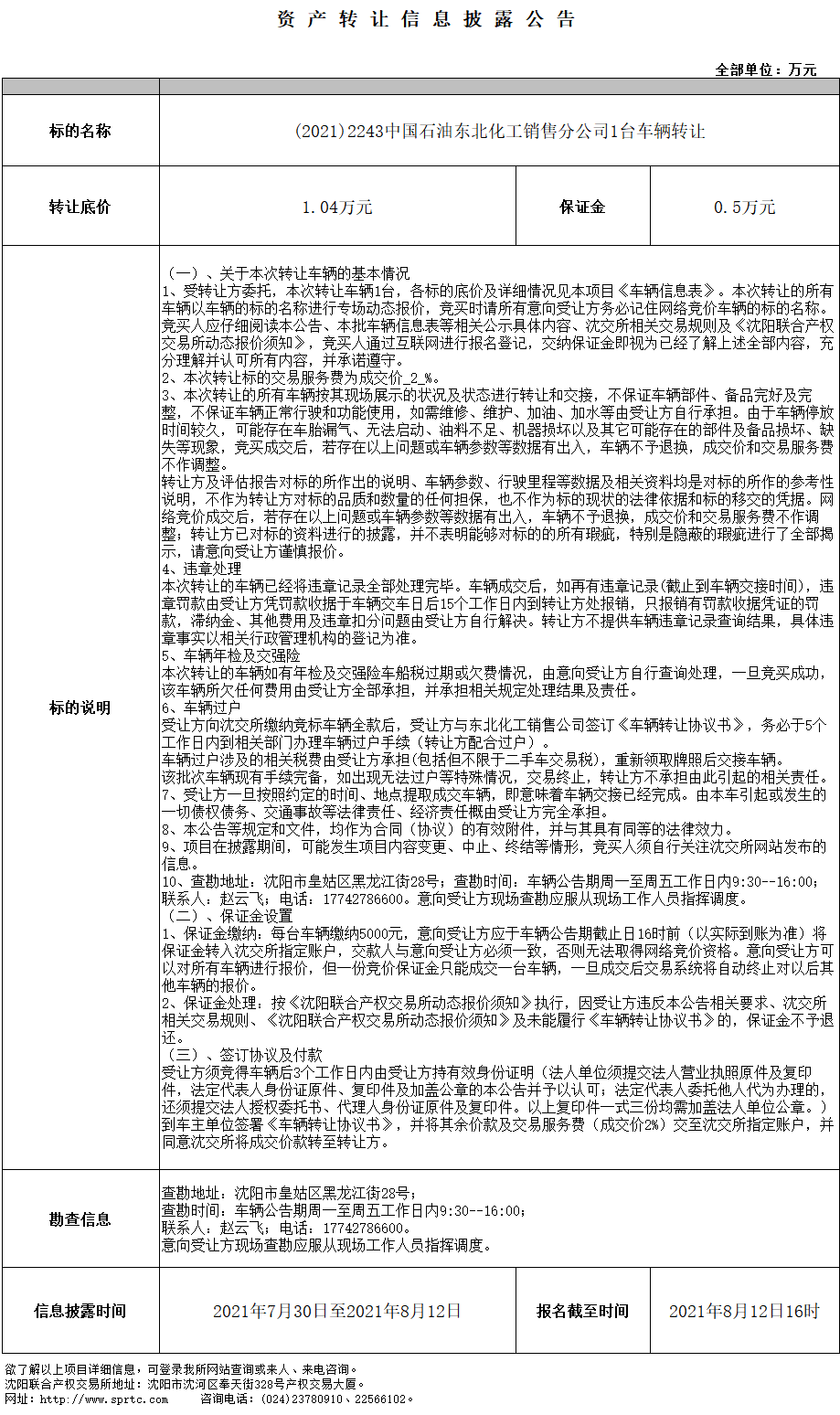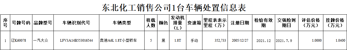 (2021)2243中國石油東北化工銷售分公司1臺車輛轉讓