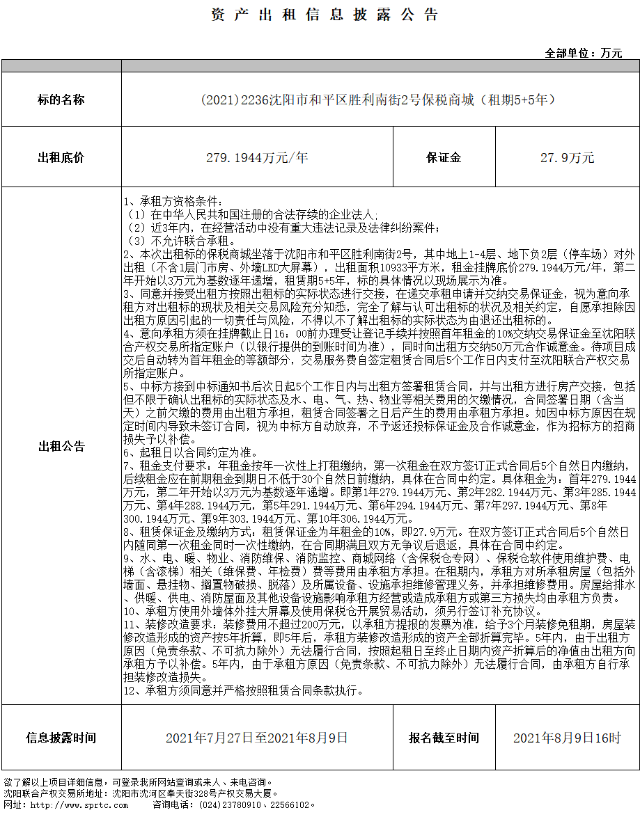 沈陽市和平區(qū)勝利南街2號保稅商城(租期5年+5年)