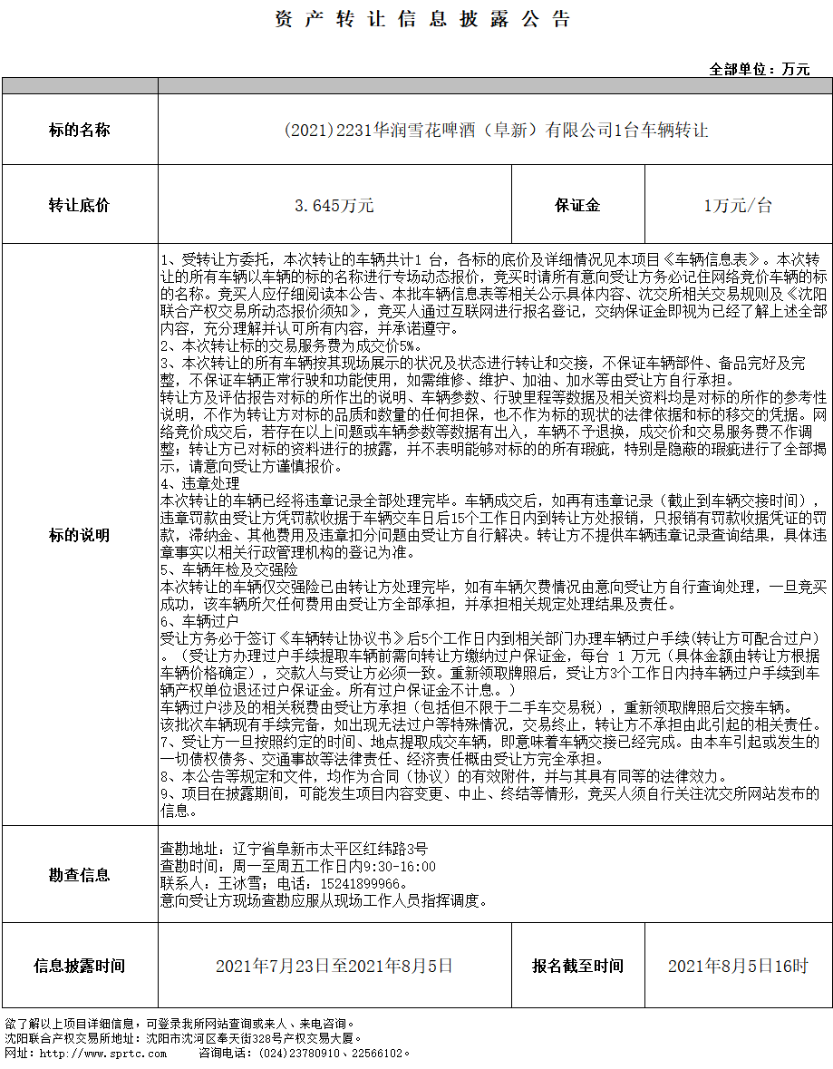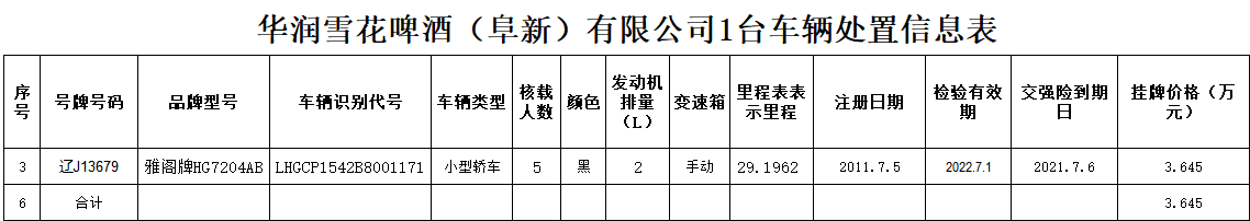 華潤(rùn)雪花啤酒(阜新)有限公司1臺(tái) 車(chē)輛轉(zhuǎn)讓