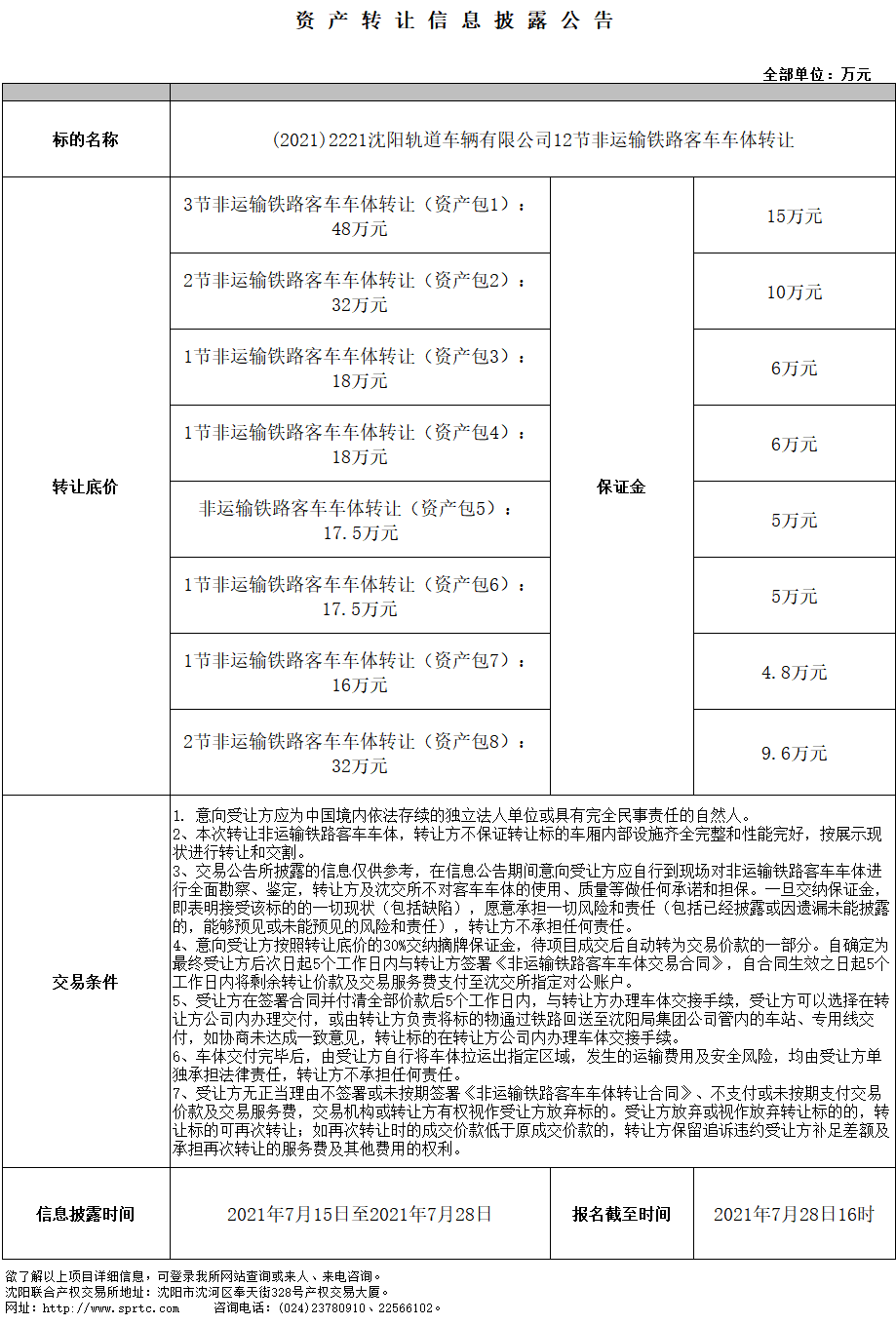 (2021)2221沈陽軌道車輛有限公司12節(jié)非運(yùn)輸鐵路客車車體轉(zhuǎn)讓