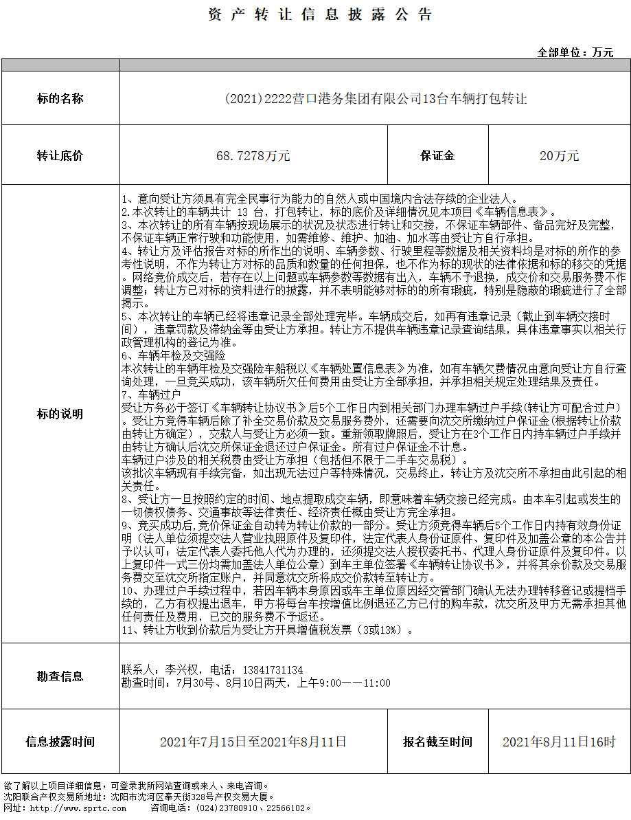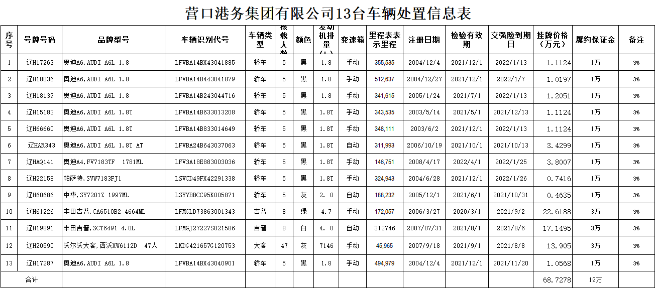 營口港務(wù)集團有限公司13臺車輛打包轉(zhuǎn)讓