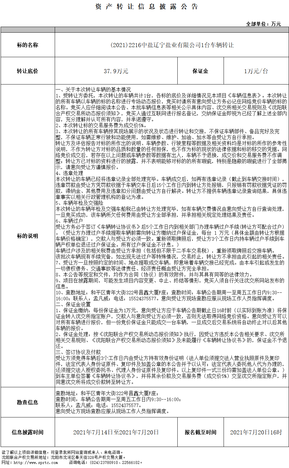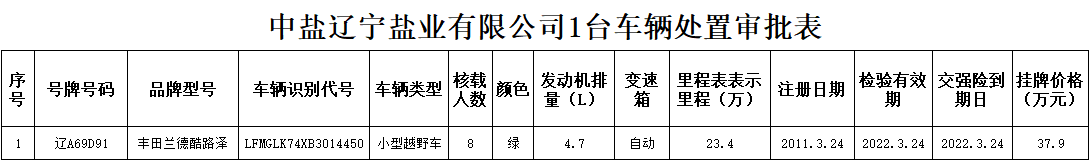 中鹽遼寧鹽業(yè)有限公司1臺(tái)車(chē)輛轉(zhuǎn)讓