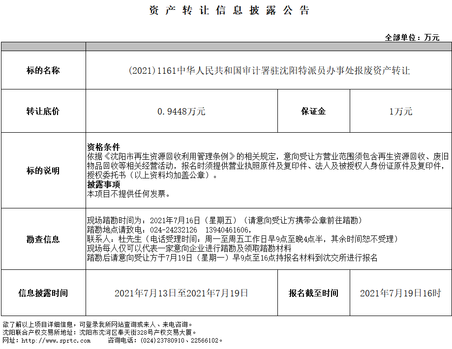中華人民共和國(guó)審計(jì)署駐沈陽特派員辦事處報(bào)廢資產(chǎn)轉(zhuǎn)讓